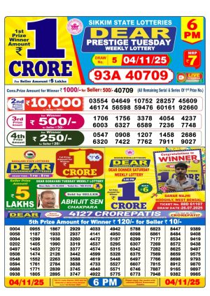 Dear Lottery Monthly Chart 6PM Result Sikkim State 07.11.25