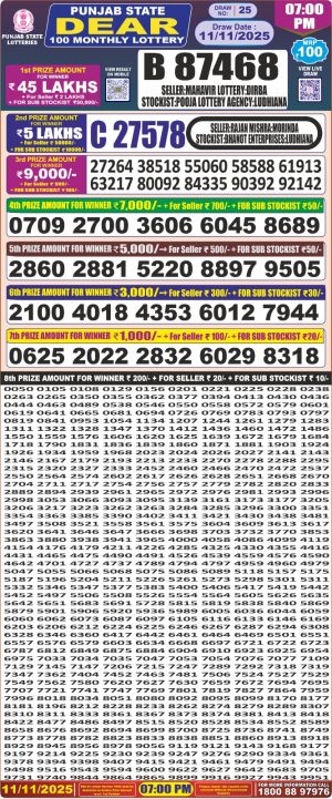 Punjab State Lottery Dear 100 Monthly Result 11.11.25 7pm
