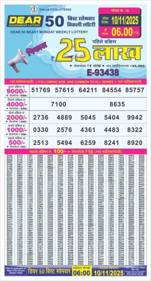 Dear Monthly Chart Punjab State Dear 50 6PM Lottery Result 10.11.25