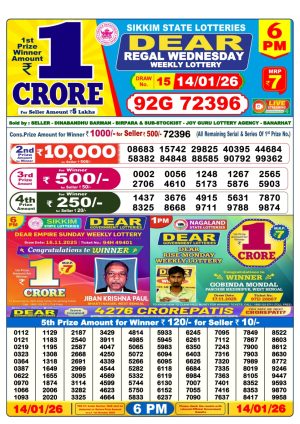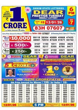 Dear Lottery Monthly Chart 6PM Result Sikkim State 14.01.26
