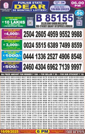 Punjab State Dear 50 Monthly Lottery Result 16.09.25 Winners