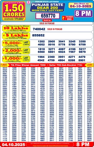 Punjab State Dear 200 Monthly Lottery Result 04.10.25 Publish