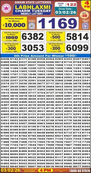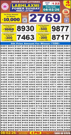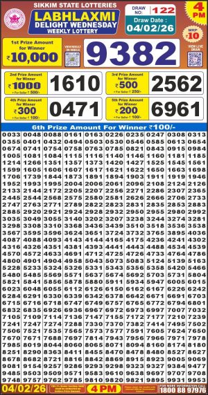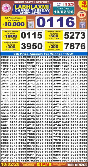 Dear Monthly Chart Labh Laxmi Lottery 4PM Result 10.02.26