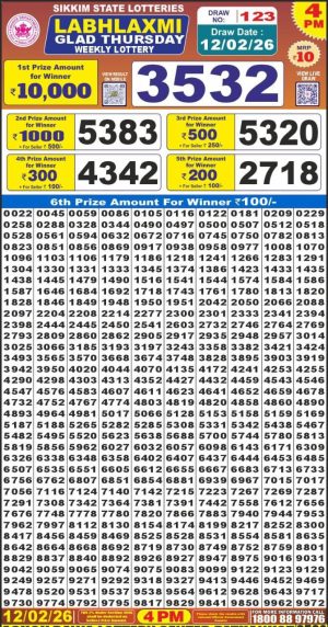 Dear Monthly Chart Labh Laxmi Lottery 4PM Result 12.02.26