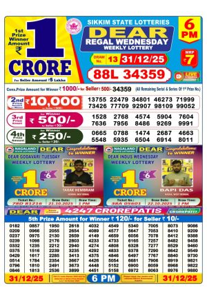 Dear Lottery Monthly Chart 6PM Result Sikkim State 31.12.25
