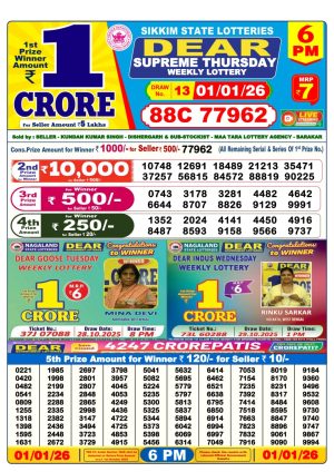 Dear Lottery Monthly Chart 6PM Result Sikkim State 13.01.26