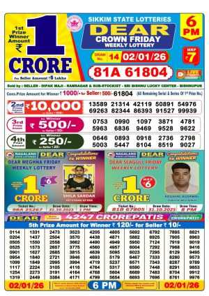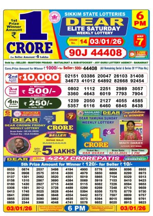 Dear Lottery Monthly Chart 6PM Result Sikkim State 14.01.26