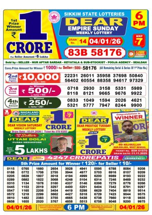 Dear Lottery Monthly Chart 6PM Result Sikkim State 04.01.26