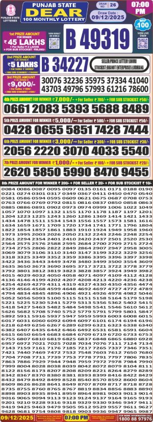 Dear Monthly Chart Punjab State Dear 100 Monthly 7PM Lottery Result 09.12.25