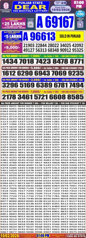 Dear Monthly Chart Punjab State Dear 100 Monthly 7PM Lottery Result 10.02.26