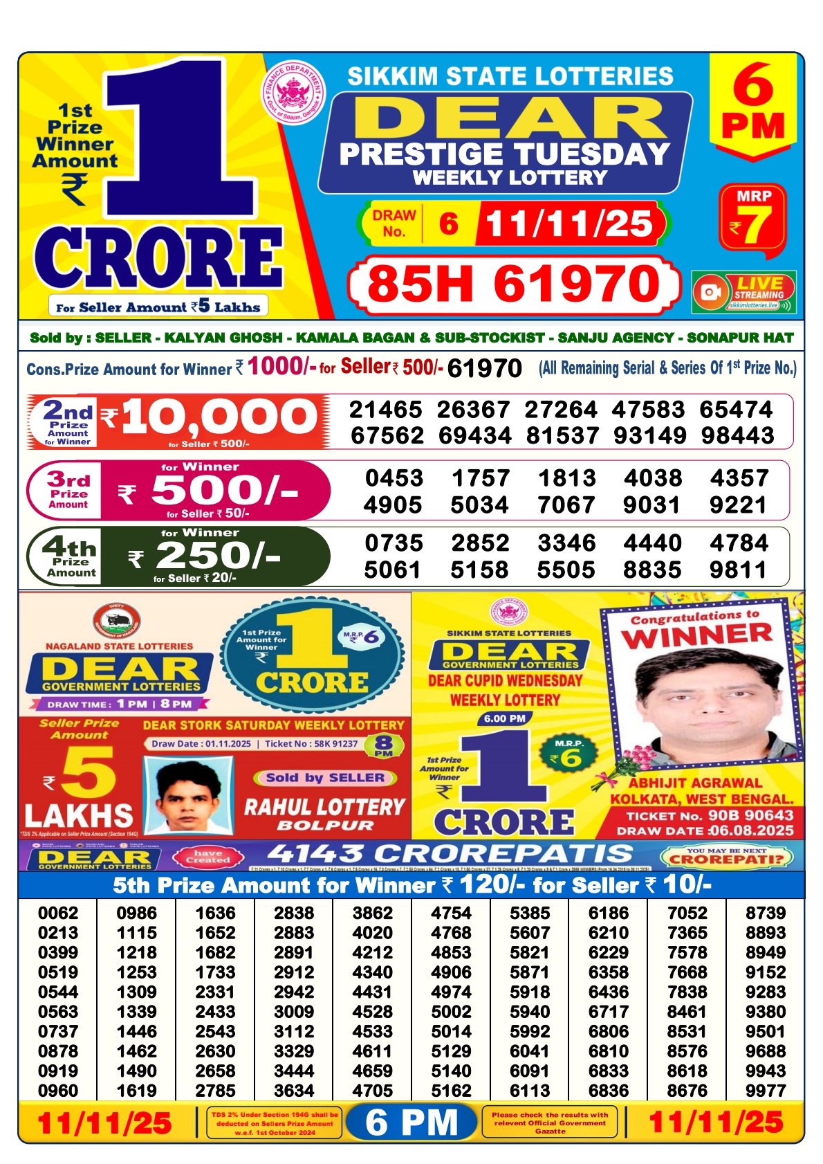 Dear Lottery Monthly Chart 6PM Result Sikkim State 11.11.25
