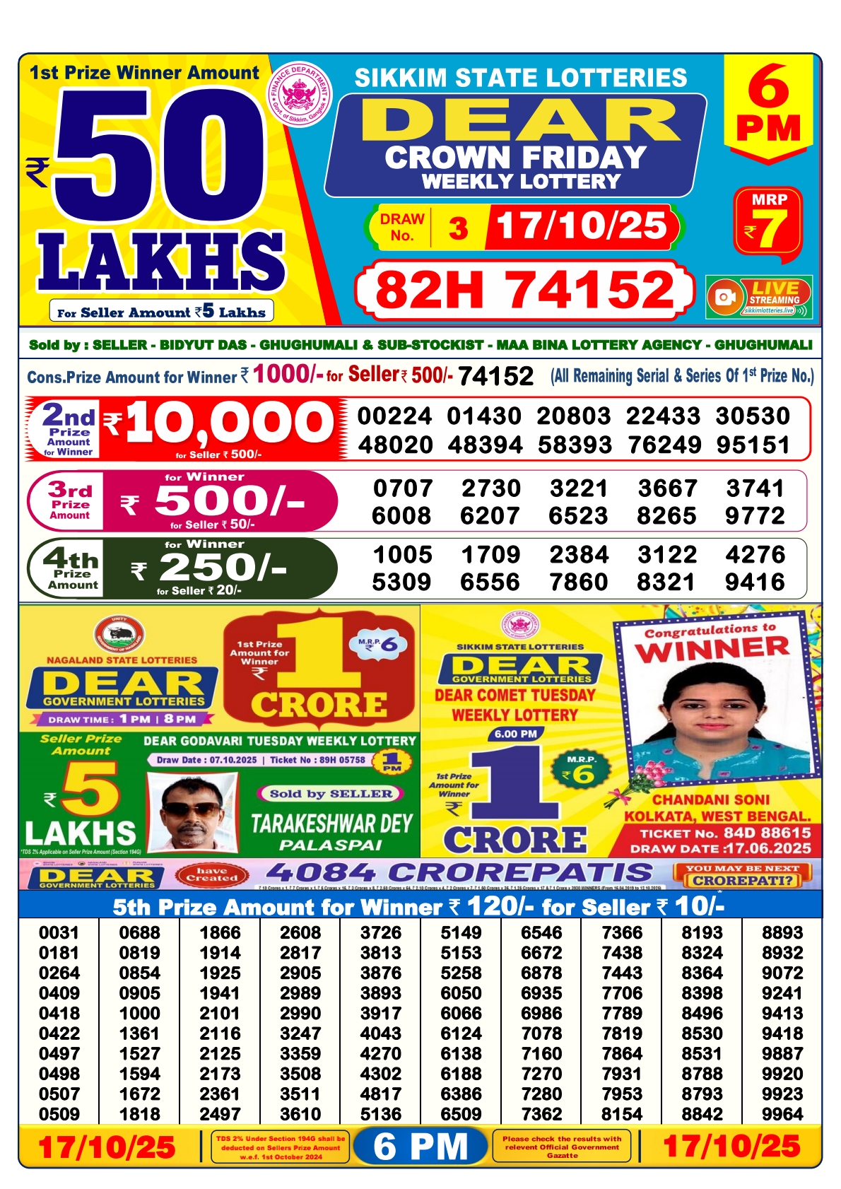Dear Lottery Monthly Chart 6PM Result Sikkim State 17.10.25