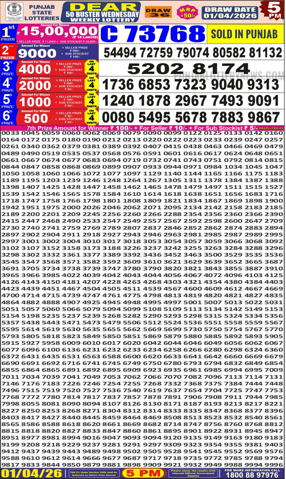 Dear Monthly Chart Punjab State Dear 50 5PM Lottery Result 01.04.26 April 1, 2026 Leave a Comment on Dear Monthly Chart Punjab State Dear 50 5PM Lottery Result 01.04.26 Share: XFacebookPinterestRedditVKDiggLinkedinMix