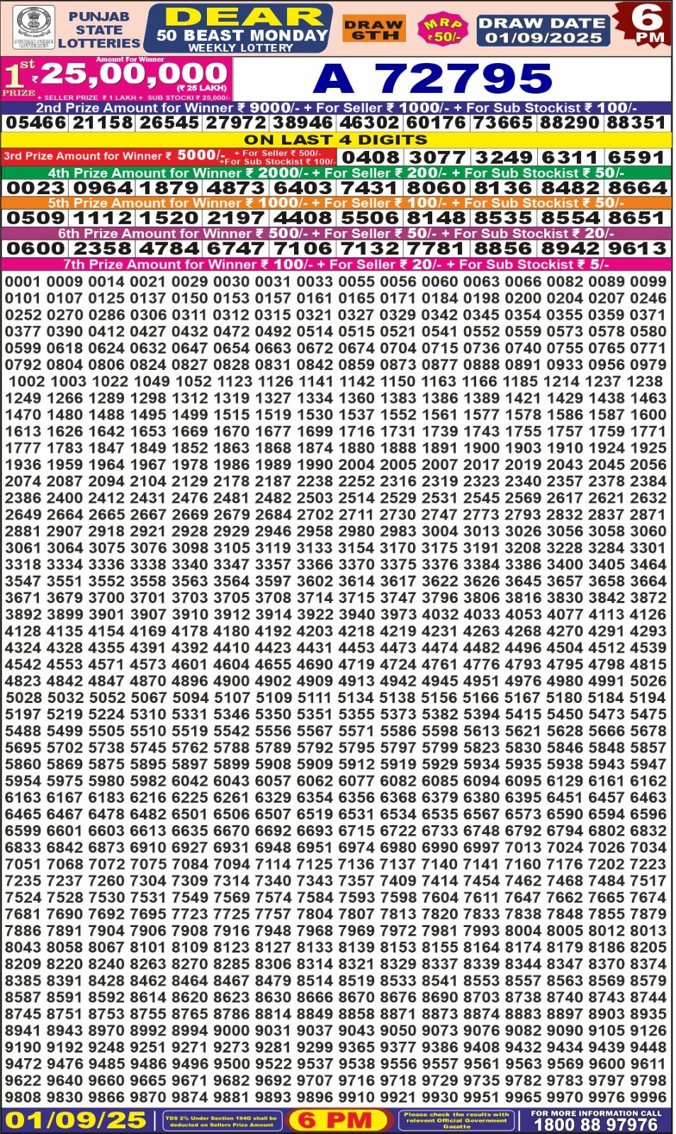 Dear Monthly Chart Punjab State Dear 50 6PM Lottery Result 01.09.25 September 1, 2025 Leave a Comment on Dear Monthly Chart Punjab State Dear 50 6PM Lottery Result 01.09.25 Share: XFacebookPinterestRedditVKDiggLinkedinMix