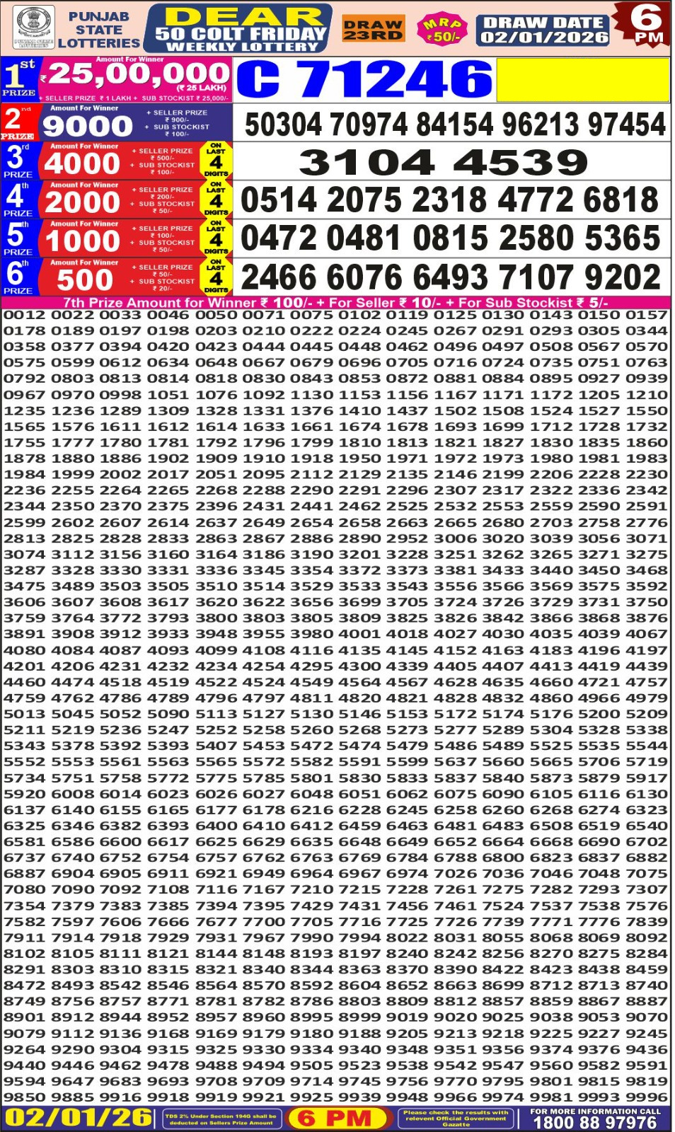 Dear Monthly Chart Punjab State Dear 50 6PM Lottery Result 02.01.26 January 2, 2026 Leave a Comment on Dear Monthly Chart Punjab State Dear 50 6PM Lottery Result 02.01.26 Share: XFacebookPinterestRedditVKDiggLinkedinMix