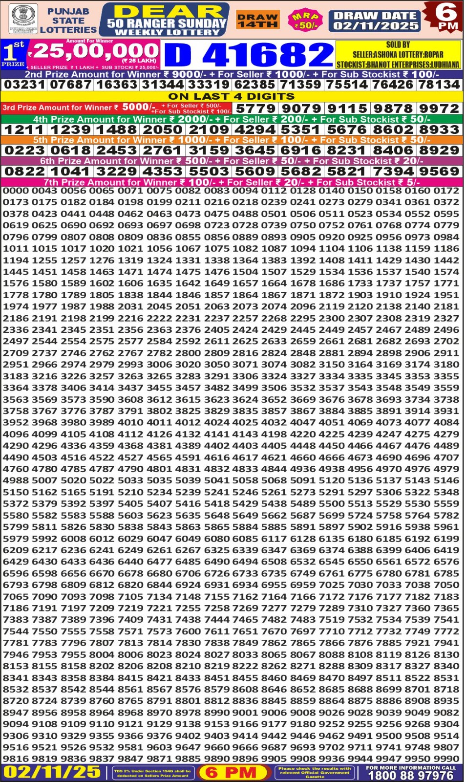 Dear Monthly Chart Punjab State Dear 50 6PM Lottery Result 02.11.25