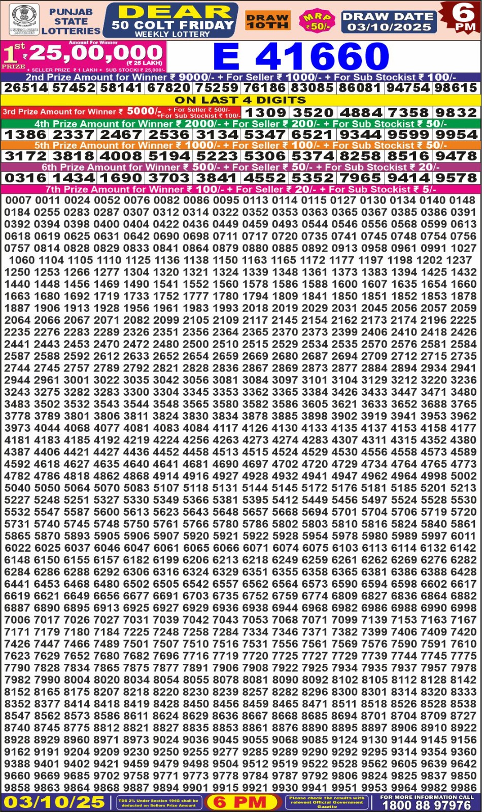 Dear Monthly Chart Punjab State Dear 50 6PM Lottery Result 03.10.25 October 3, 2025 Leave a Comment on Dear Monthly Chart Punjab State Dear 50 6PM Lottery Result 03.10.25 Share: XFacebookPinterestRedditVKDiggLinkedinMix