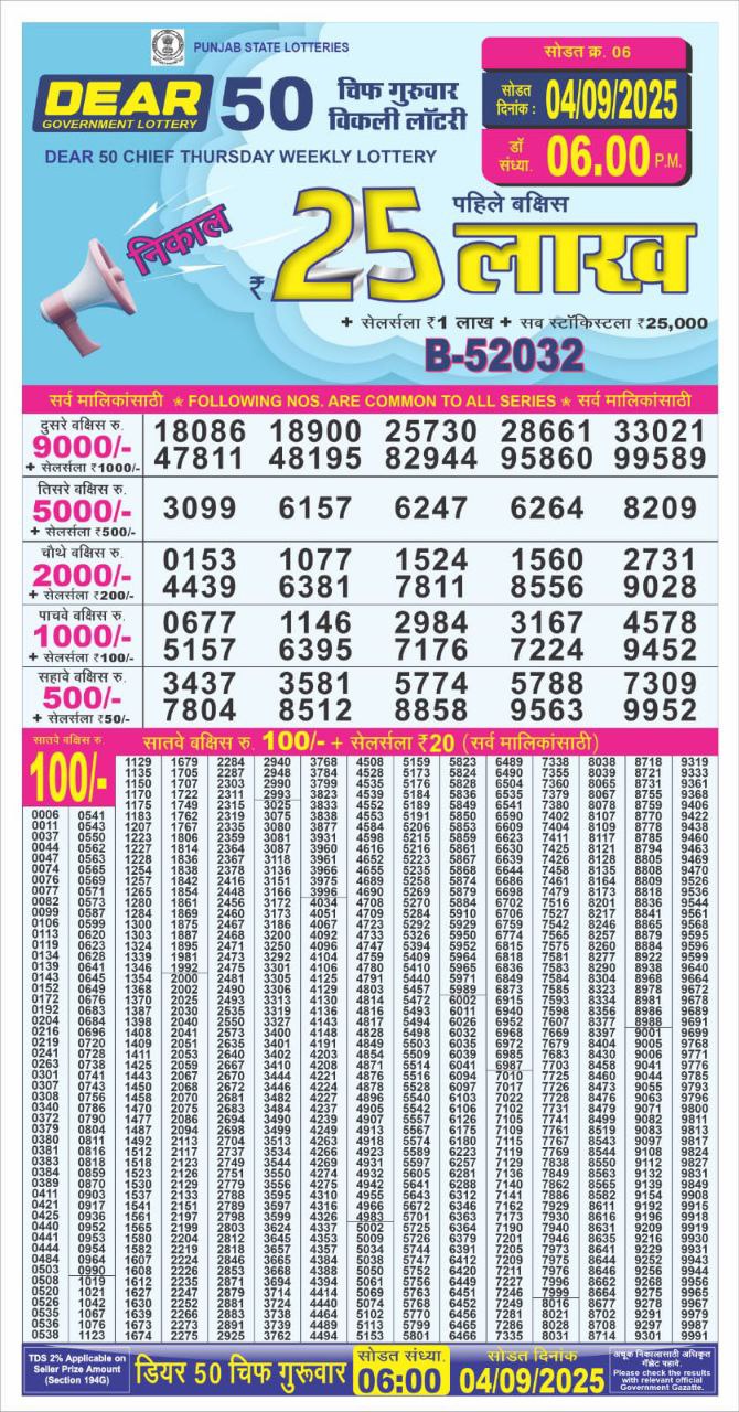 Dear Monthly Chart Punjab State Dear 50 6PM Lottery Result 04.09.25 September 4, 2025 Leave a Comment on Dear Monthly Chart Punjab State Dear 50 6PM Lottery Result 04.09.25 Share: XFacebookPinterestRedditVKDiggLinkedinMix