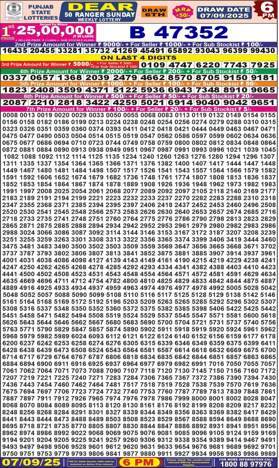 Dear Monthly Chart Punjab State Dear 50 6PM Lottery Result 07.09.25 September 7, 2025 Leave a Comment on Dear Monthly Chart Punjab State Dear 50 6PM Lottery Result 07.09.25 Share: XFacebookPinterestRedditVKDiggLinkedinMix