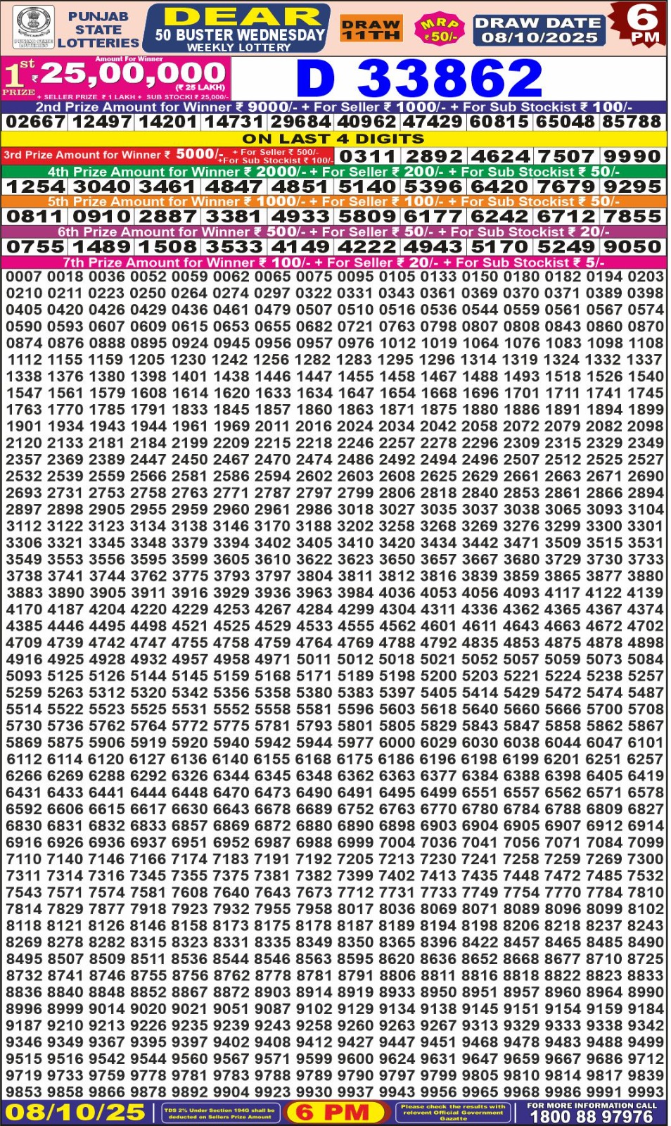 Dear Monthly Chart Punjab State Dear 50 6PM Lottery Result 08.10.25