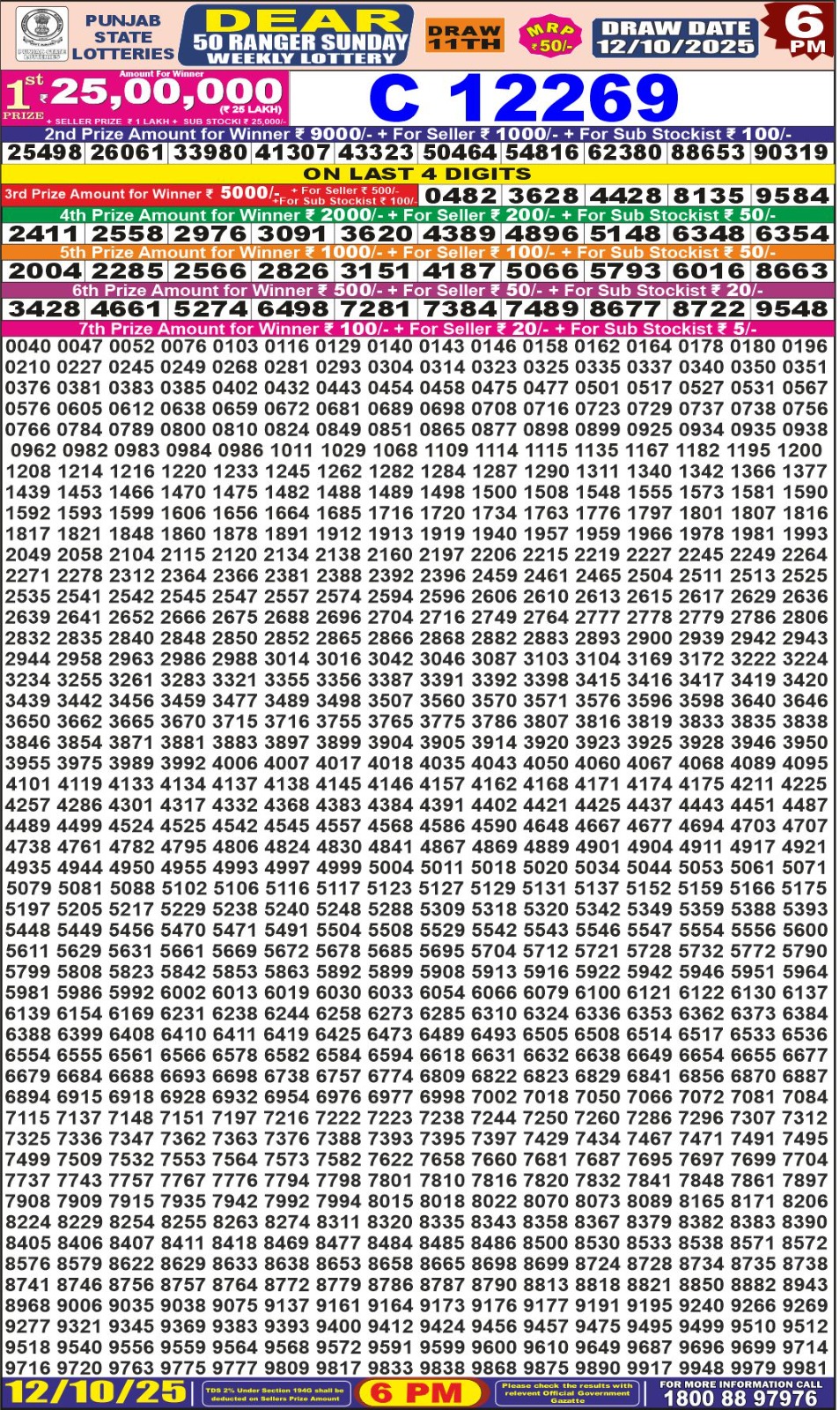 Dear Monthly Chart Punjab State Dear 50 6PM Lottery Result 12.10.25