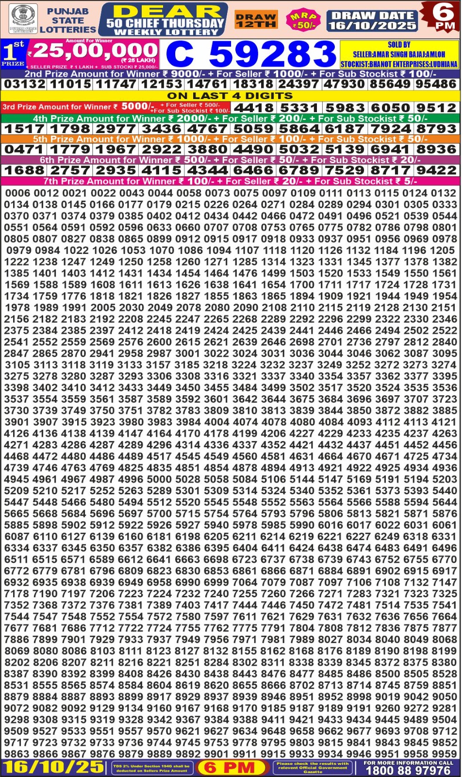 Dear Monthly Chart Punjab State Dear 50 6PM Lottery Result 16.10.25