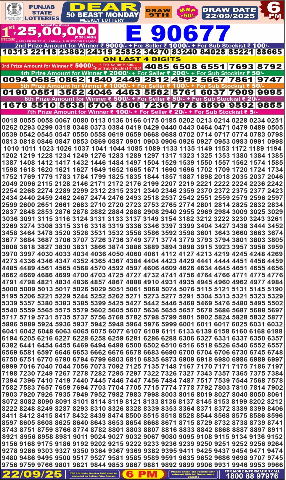 Dear Monthly Chart Punjab State Dear 50 6PM Lottery Result 22.09.25 September 22, 2025 Leave a Comment on Dear Monthly Chart Punjab State Dear 50 6PM Lottery Result 22.09.25 Share: XFacebookPinterestRedditVKDiggLinkedinMix