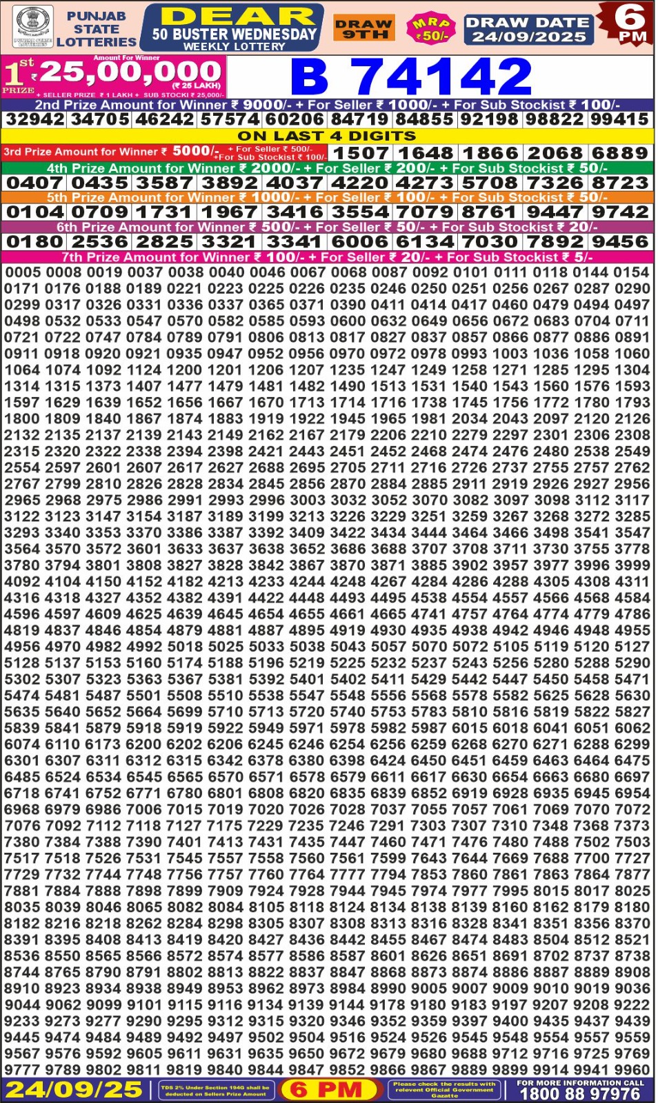 Dear Monthly Chart Punjab State Dear 50 6PM Lottery Result 24.09.25 September 24, 2025 Leave a Comment on Dear Monthly Chart Punjab State Dear 50 6PM Lottery Result 24.09.25 Share: XFacebookPinterestRedditVKDiggLinkedinMix