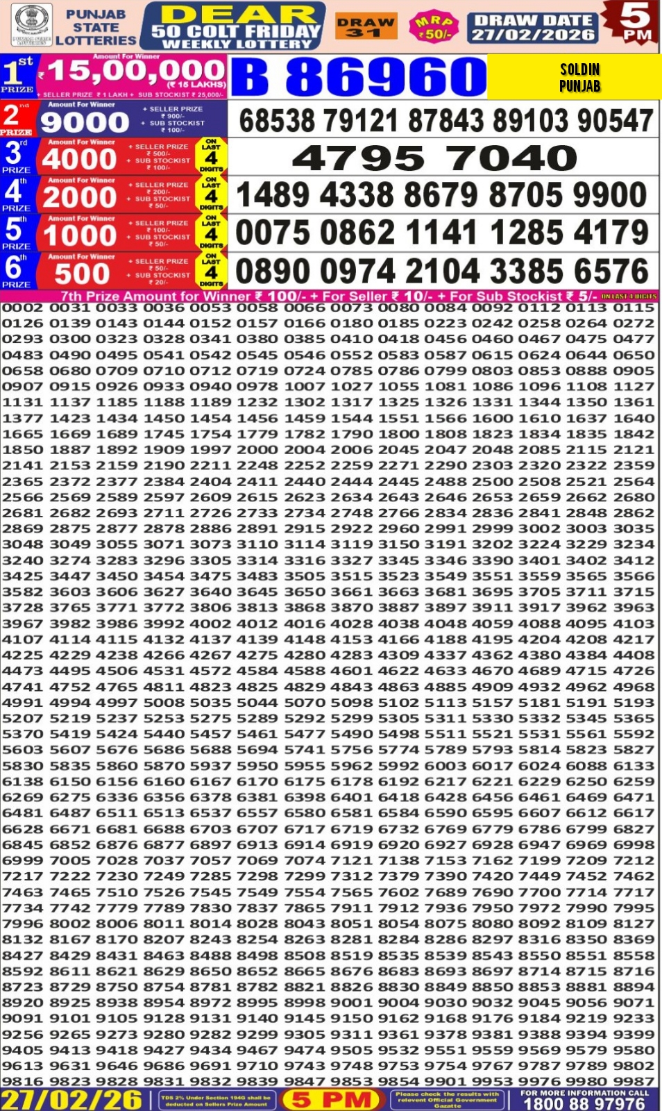 Dear Monthly Chart Punjab State Dear 50 5PM Lottery Result 27.02.26 February 27, 2026 Leave a Comment on Dear Monthly Chart Punjab State Dear 50 5PM Lottery Result 27.02.26 Share: XFacebookPinterestRedditVKDiggLinkedinMix