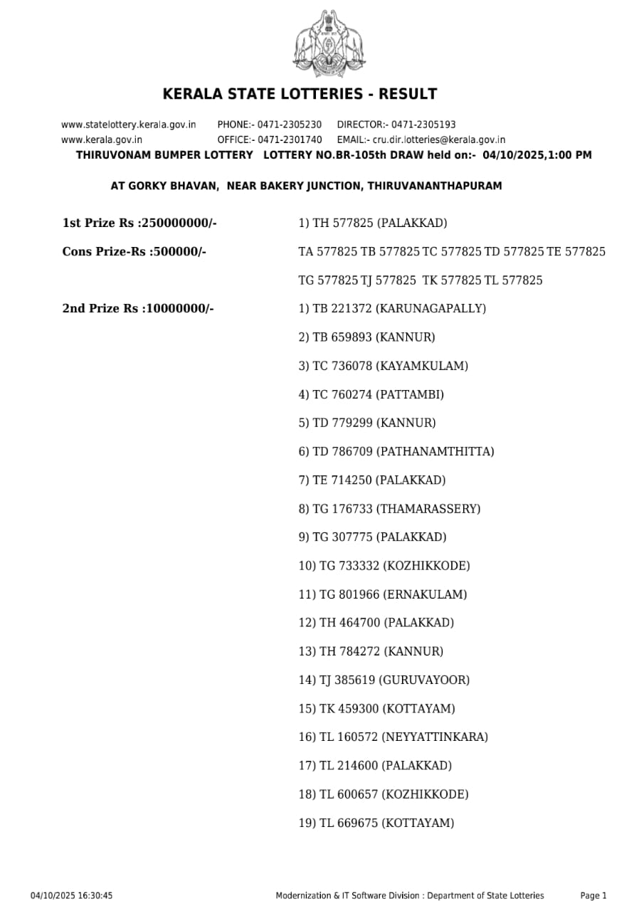 Kerala Bumper BR-105 Lottery Result 04.10.25 Publish October 4, 2025 Leave a Comment on Kerala Bumper BR-105 Lottery Result 04.10.25 Publish Share: XFacebookPinterestRedditVKDiggLinkedinMix