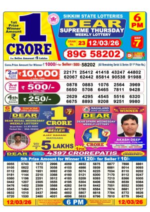 Dear Lottery Chart 6PM Result Sikkim State 12.03.26