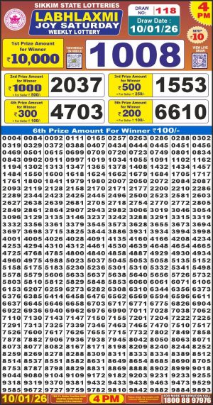 Dear Lottery Monthly Chart 6PM Result Sikkim State 10.01.26