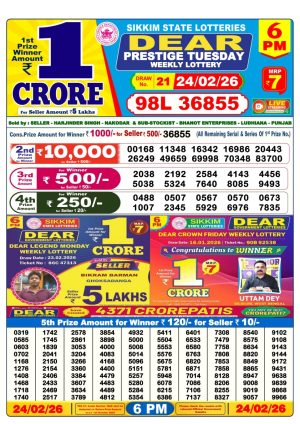 Dear Lottery Chart 6PM Result Sikkim State 24.02.26
