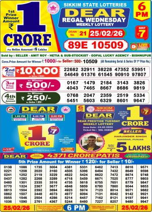 Dear Lottery Chart 6PM Result Sikkim State 25.02.26