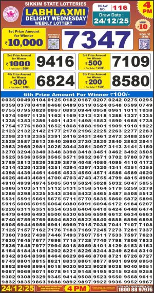 Dear Lottery Monthly Chart 6PM Result Sikkim State 24.12.25