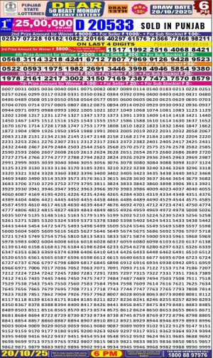 Dear Monthly Chart Punjab State Dear 50 6PM Lottery Result 20.10.25