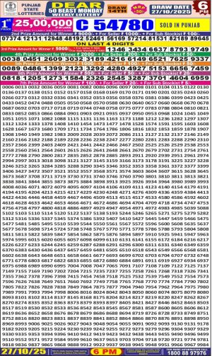 Dear Monthly Chart Punjab State Dear 50 6PM Lottery Result 27.10.25